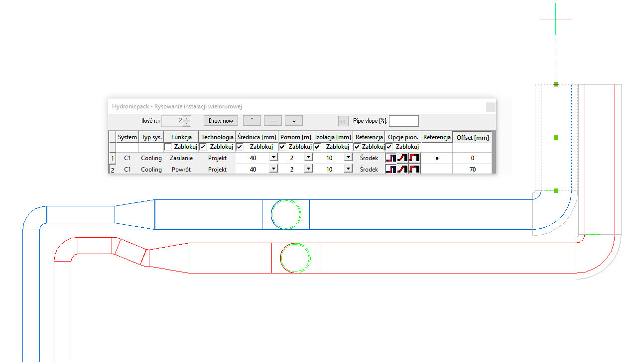 Design single or multiple pipes turn by turn, specifying points on the drawing. While tracing the path, you can change the type of pipe („Technology”), diameter, elevation, insulation or set the distance between pipes („Offset”). It is also possible to create risers by selecting the desired locations, starting drawing then changing the elevation and pressing the „Draw now” button to finish; sloped pipes can also be drawn by setting the „Pipe slope” parameter.
